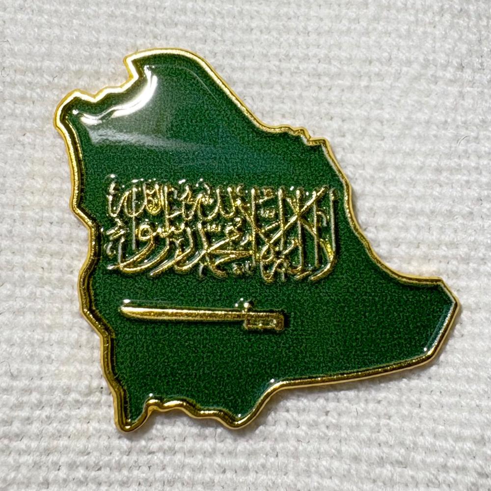 ملصق معدني بشكل خريطة المملكة العربية السعودية مزين بعلم الوطن بألوانه الوطنية الأخضر والأبيض والذهبي تصميم دقيق يعكس حب الوطن ويمثل رمزاً وطنياً مميزاً.